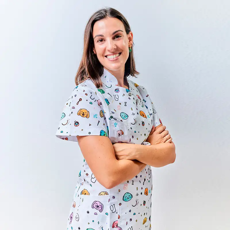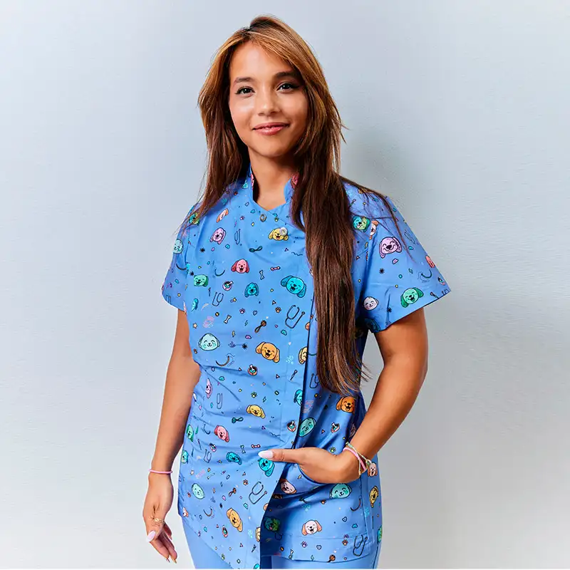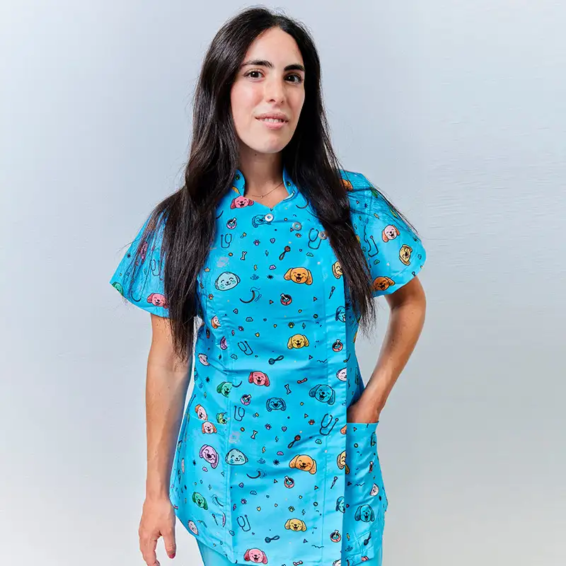 Disponible en colores blanco, azul y morado, así como en estampados exclusivos con perros y gatos, esta prenda no solo transmite profesionalidad, también refleja cercanía y amor por los animales.